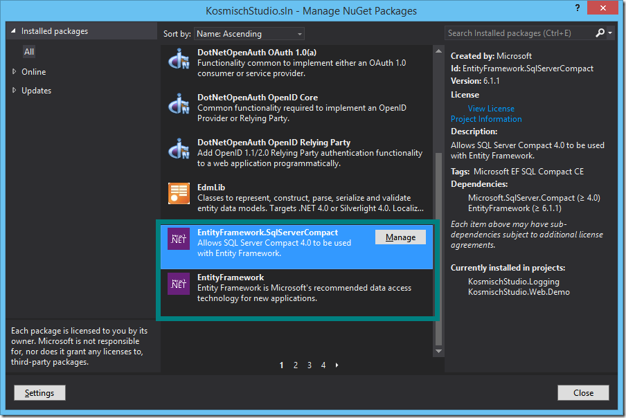 You can also use ORM tool like Entity Framework 6.0 to manipulate data in SQL CE databases. Before you start, you need to install two packages in NuGet: EntityFramework.SqlServerCompact 6.0 and EntityFramework 6.0.