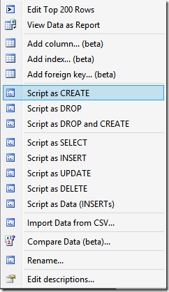 This tool provides both database and table level functions, which enables you to generate EntityFramework models and SQL scripts.