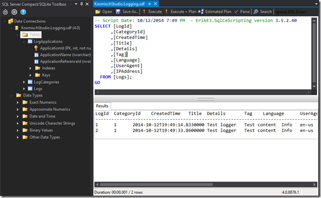 SQL Server Compact 4.0 (CE 4.0) is a free SQL Server embedded database ideal for building standalone and occasionally connected applications for mobile devices, desktops, Web clients and others. In one of my projects, I used it as the database for logging errors, which assumes the errors will only occur occasionally. It is not very straightforward compared with working with SQL Server, but it is quite handy with the helps of some tools and components.