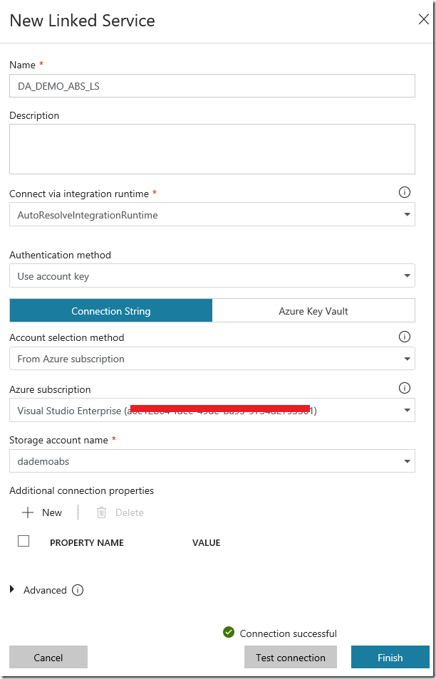 The following screenshot shows my settings for the linked service to Azure Blob Storage.