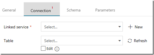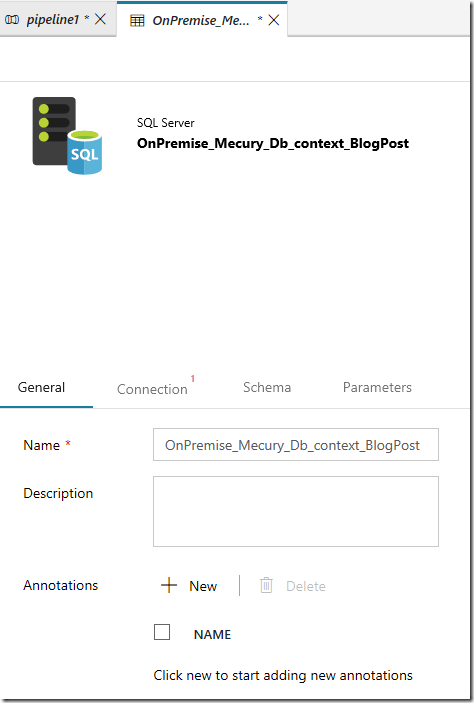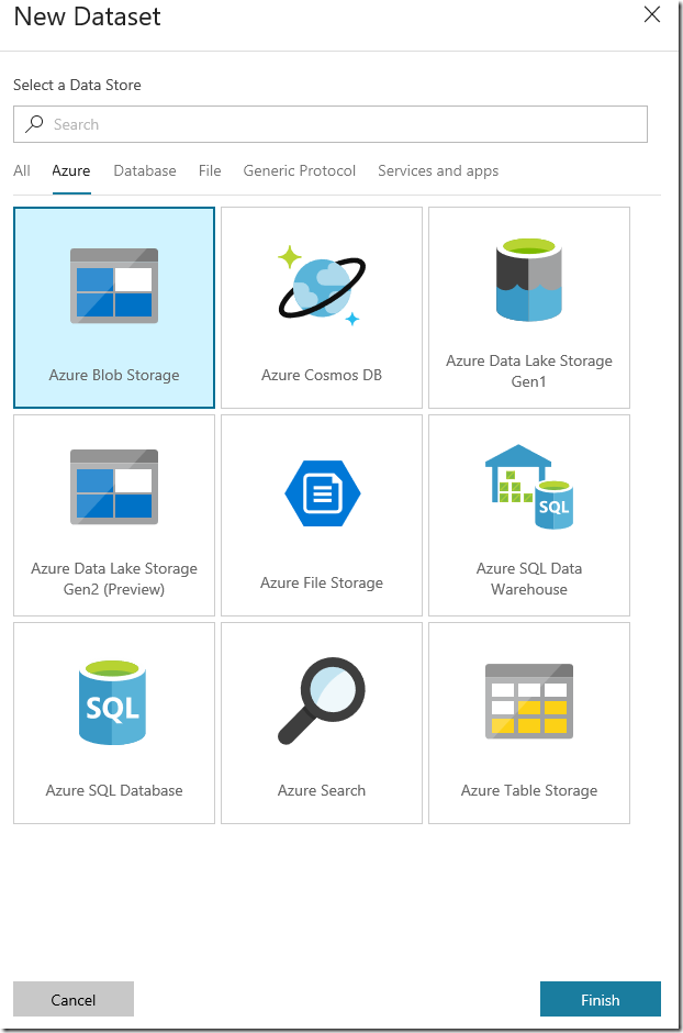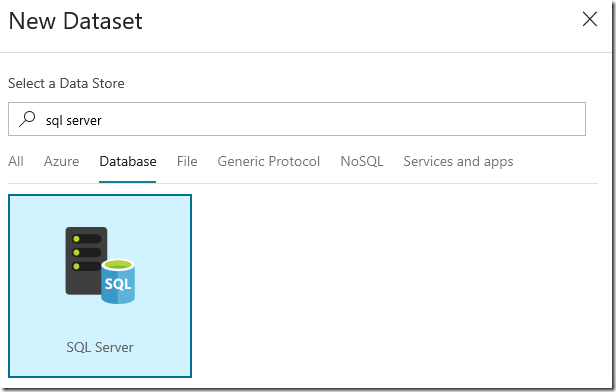 Select SQL Server as Data Store and then click Finish button to go to the dataset UI to setup the properties for the dataset.