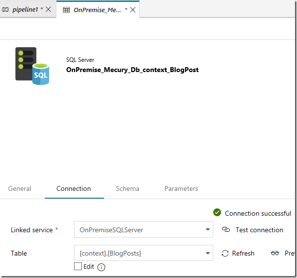 Till now, we have completed the step to ingest data from on-premise SQL Server database into Cloud. The follow items are created in data factory: