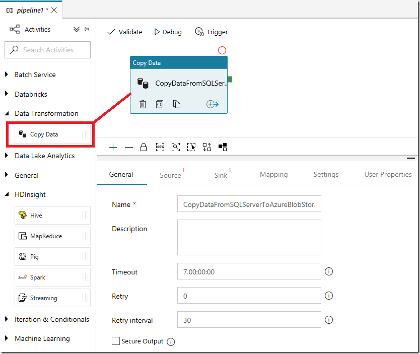 Drag ‘Copy Data’ activity from Data Transformation category to create an activity named CopyDataFromSQLServerToAzureBlobStorage.