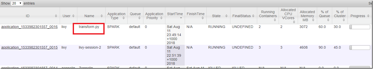 In my environment, the script file is named transform.py and is stored in sparktransform folder.