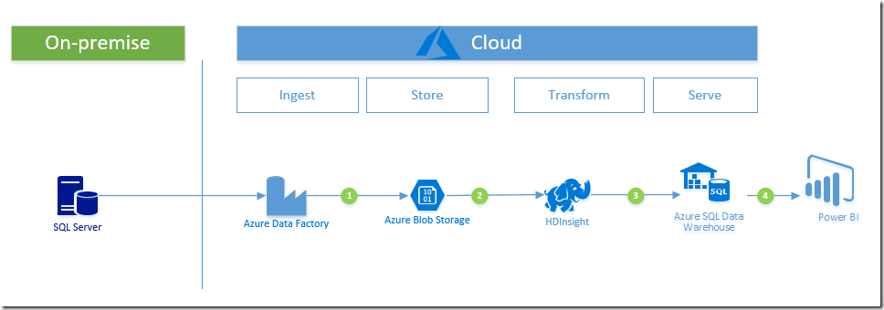 In this page, I am going to demonstrate how to ingest data from on-premise data to cloud by using Data Factory and then transform data using HDInsights before loading data into Azure SQL Data Warehouse. Eventually the data is consumed by Power BI.