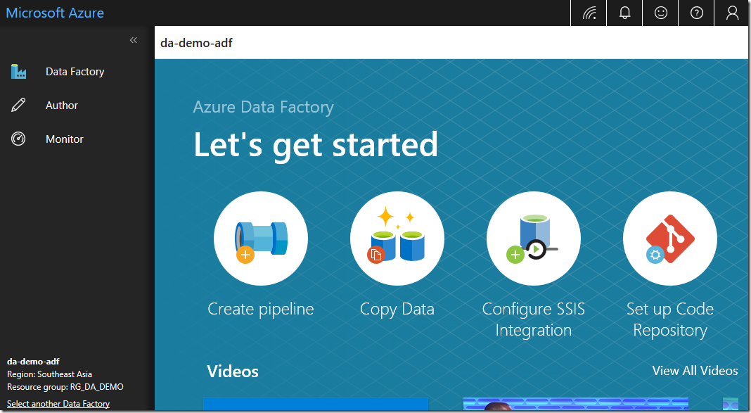 Once the resource is created, click Author & Monitor button to go to Azure Data Factory workspace.