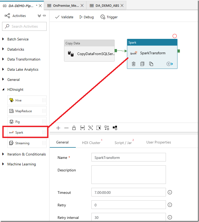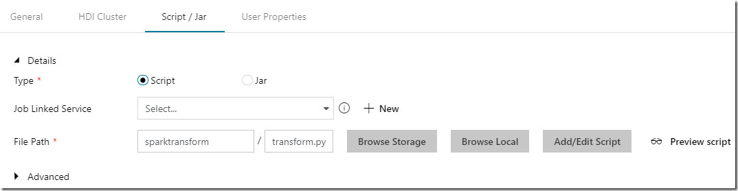 Now we need to configure the HDInsights cluster for this Spark activity.