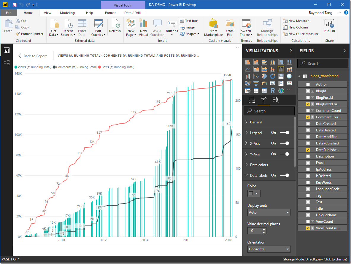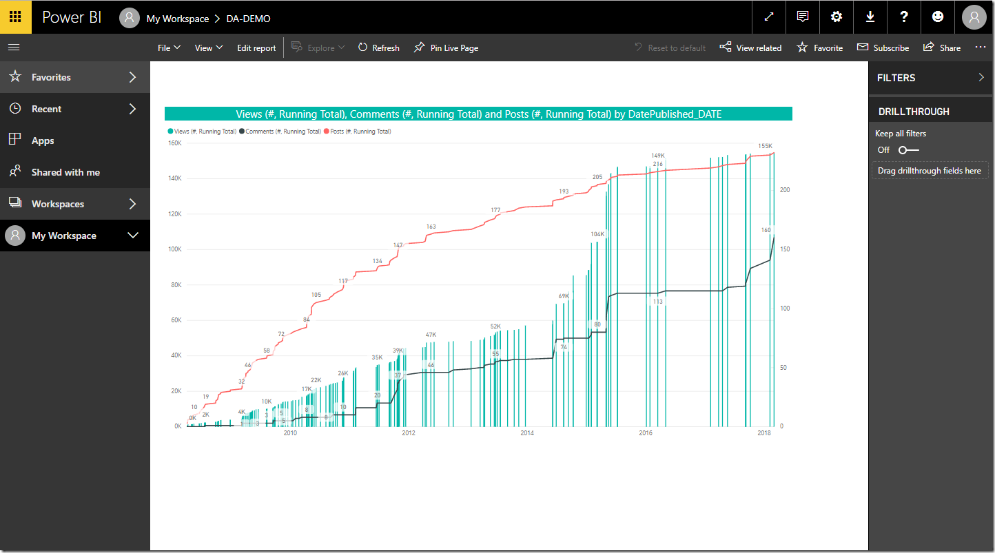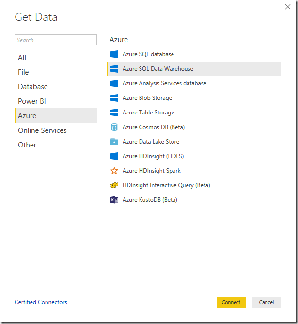Now we can visualize the data through Power BI. No matter the transformed data is stored in Azure Blob Storage or Azure SQL Data Warehouse, Power BI has connectors available to get data from them.