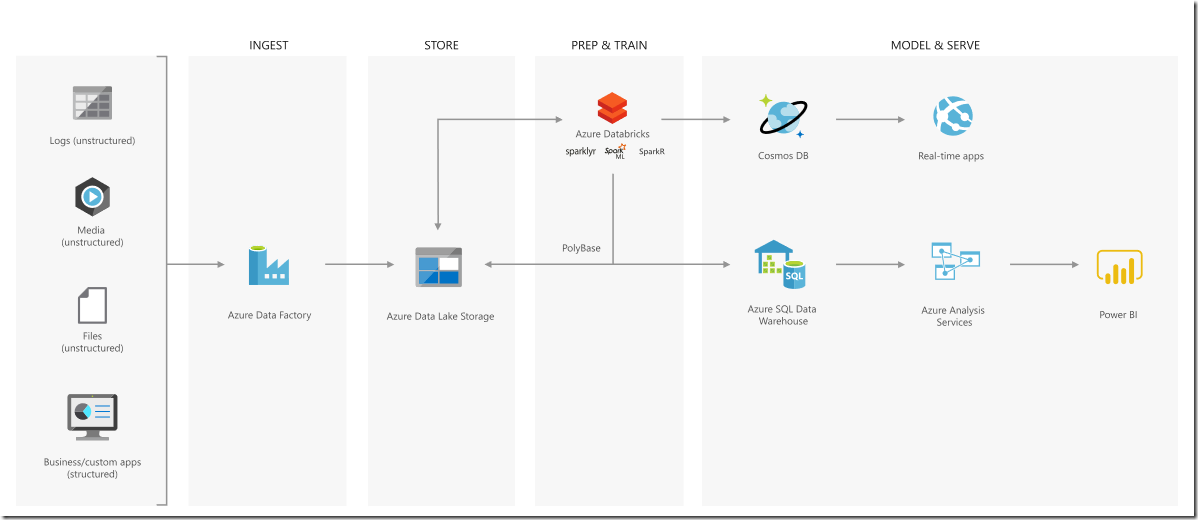 - Prep & Train: In this layer, data can be cleaned and transformed using Azure Databricks. Databricks is an Apache Spark based analytics platform. Python, Scala, R and other language interpreters can be to analyse data. Spark machine learning libraries can also be used to create models.