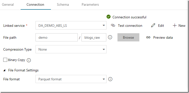 - Dataset for Azure Blob Storage: DA_DEMO_ABS
