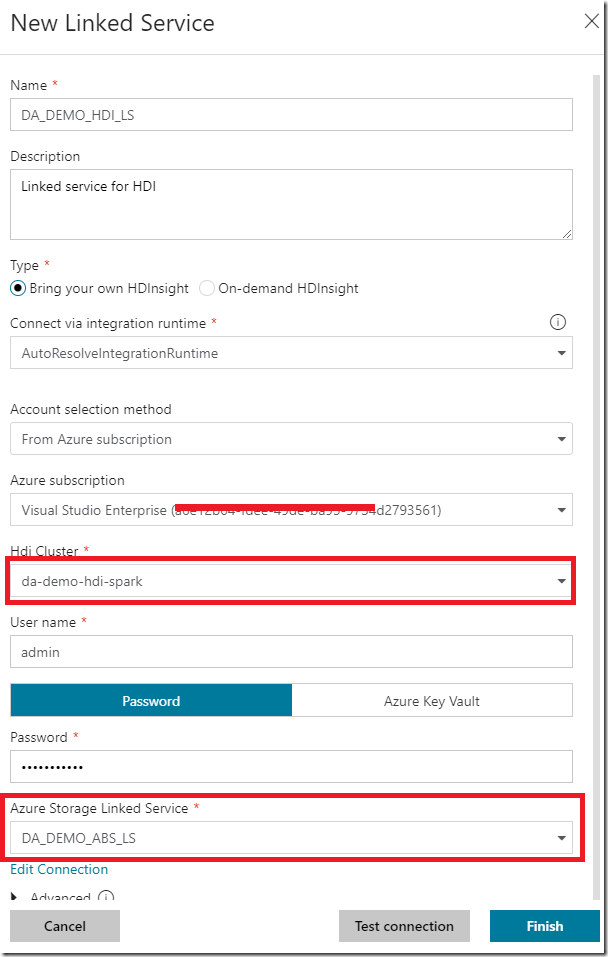 For this tutorial, I am using a predefined HDInsight cluster and also linking the Azure Storage to it too.