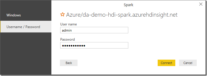 The detailed steps about how to use HDInsights Spark as source are available here: https://docs.microsoft.com/en-us/power-bi/spark-on-hdinsight-with-direct-connect.