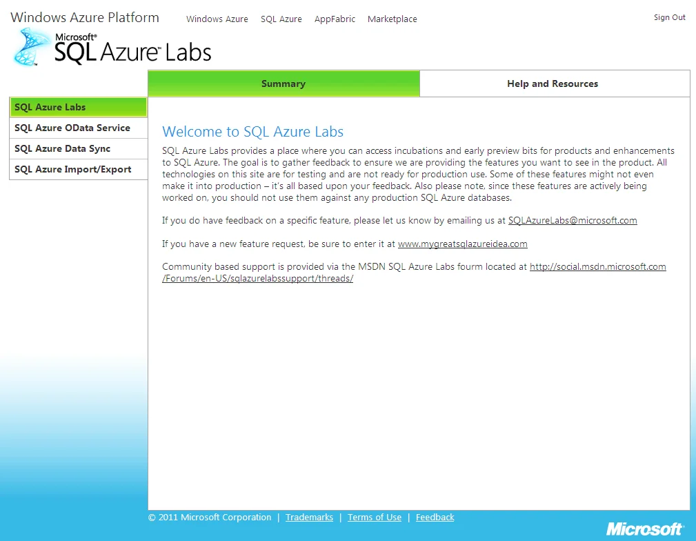 5)Microsoft® Project Code-Named “Houston” 访问地址https://www.sqlazurelabs.com/。目前该工具处理CTP阶段,可以用于oData数据服务注册管理,SQL Azure数据库同步,数据导入导出等。