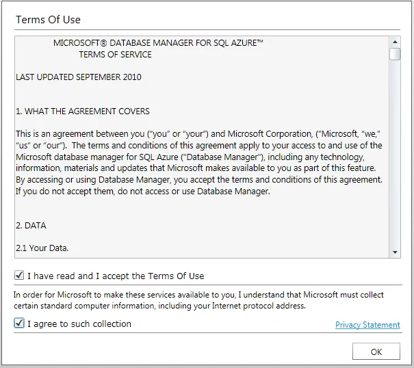 随即会打开新的窗口,连接到对应的Database Manager管理网站,勾选同意使用协议: