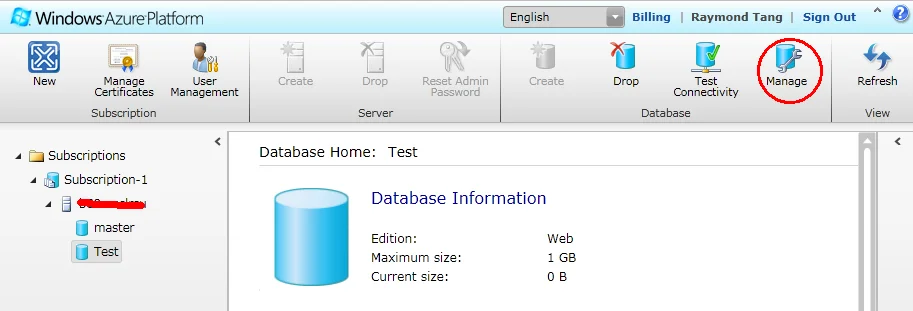 测试完成后将删除这个数据库,在Windows Azure Management Portal中选中数据库节点,点击菜单栏Database组的Drop按钮,即可删除: