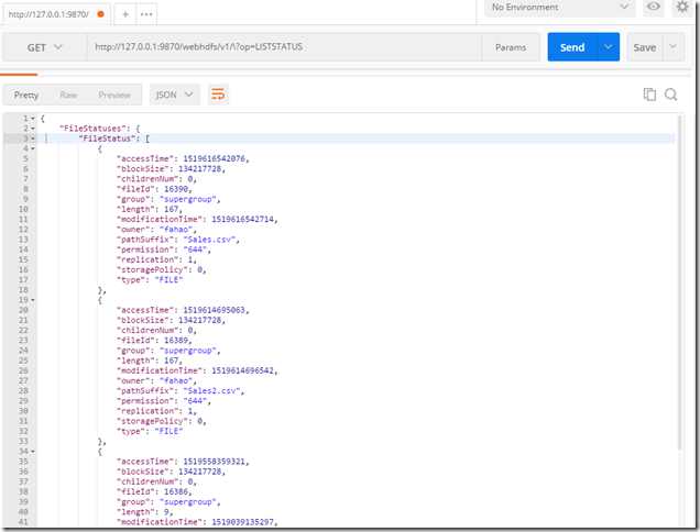 var protocal = "http"; var host = "127.0.0.1"; var port = 9870; var hdfsFilePath = "\"; var operation = "LISTSTATUS"; var url = $"{protocal}://{host}:{port}/webhdfs/v1/{hdfsFilePath}?op={operation}"; var request = (HttpWebRequest)WebRequest.Create(url); var response = (HttpWebResponse)request.GetResponse(); using (StreamReader reader = new StreamReader(response.GetResponseStream())) { var result = reader.ReadToEnd(); Console.WriteLine(result); } }
