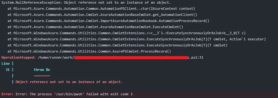 When using GitHub Actions to run Azure Az automation PowerShell module, error Object reference not set to an instance of an object was thrown out. The workflow is based on standard template: