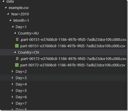 year=2019/ month=01/ day=01/ Country=CN/ part….csv